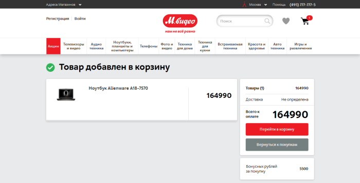 На сайте магазина «М.Видео» после нажатия на кнопку «Добавить в корзину» открывается отдельная страница, единственное возможное действие на которой – это переход в корзину или возврат к покупкам. Это пример того самого лишнего шага.
