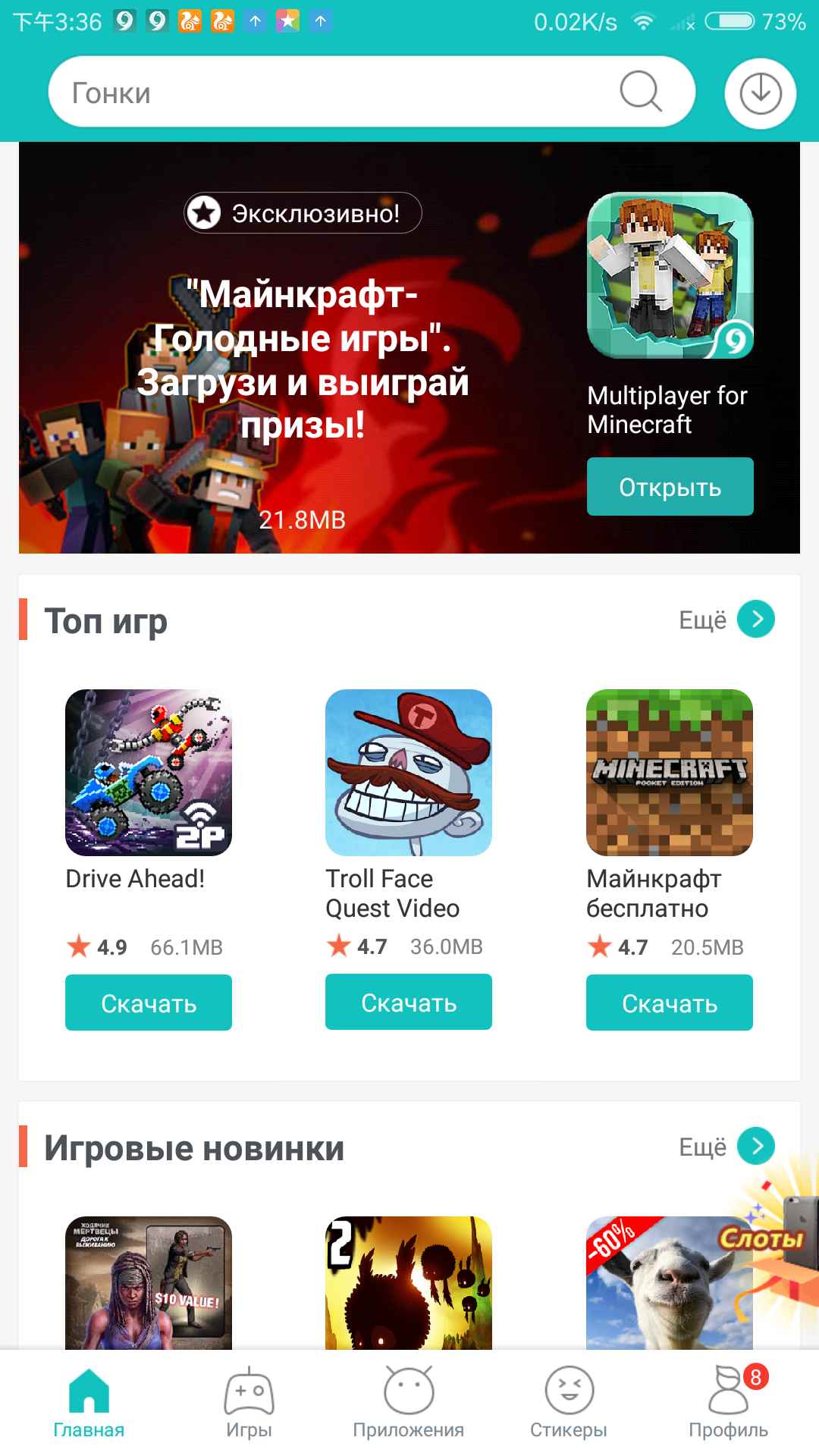 Приложение MyApp похоже на другие приличные магазины, у интерфейса есть разделы, значение которых понятно носителям китайского языка. Во время беглого осмотра неоднократно всплывала реклама, а само оформление похоже на восточный рынок – всегда что-то блестит, сверкает и переливается разными цветами, везде скидки. Этот магазин здесь приведен только как пример того, что у Google есть достойная альтернатива даже там, где большинство его сервисов запрещены как вредоносное (для безопасности и обороны) ПО.