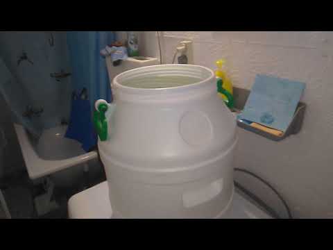 Взять герметичную тару(большую канистру, пластиковую бочку) или любую пластиковую бочку с прокладкой для плотного прилегания крышки, с двумя врезными ниппелями, одним сверху, другим в самом низу. В бочку заливается вода, но не полная емкость, и через верхний ниппель компрессором закачивается давление.
