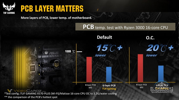За счёт большего числа фаз и лучших компонентов подсистемы питания материнских плат ASUS нагреваются меньше, чем у изделий конкурентов. На платах среднего сегмента разница температур силовых элементов цепей питания находится в пределах от примерно 35 °C до почти 50 °C при работе с «16-ядерным процессором Ryzen». Также сама печатная плата за счёт большего числа слоёв греется на 15–20 °C меньше.