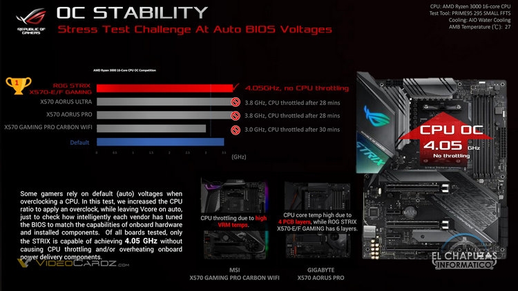 И как следствие более качественных и менее горячих подсистем питания — лучший разгонный потенциал. Например, ASUS утверждает, что на её плате Prime X570-P удалось разогнать «16-ядерный Ryzen 3000» до 3,8 ГГц по всем ядрам, тогда как плата Gigabyte X570 Gaming X обеспечила лишь 3,5 ГГц, а MSI X570-A Pro — всего 3,1 ГГц. В случае старших решений также отмечается лучшие способности плат ASUS к разгону: на них достигаются более высокие частоты и обеспечивается лучшая стабильность работы.