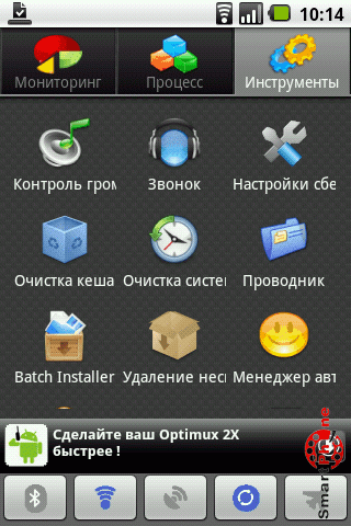 ΠΠ΄Π΅ΡΡ ΡΠΆΠ΅ Π²ΡΡΡΠΎΠ΅Π½Ρ ΡΠΏΠΎΠΌΡΠ½ΡΡΡΠ΅ Π²ΡΡΠ΅ ΠΈΠ½ΡΡΡΡΠΌΠ΅Π½ΡΡ Π΄Π»Ρ ΡΠ°Π±ΠΎΡΡ Ρ ΠΏΡΠΈΠ»ΠΎΠΆΠ΅Π½ΠΈΡΠΌΠΈ Π½Π° ΡΠΌΠ°ΡΡΡΠΎΠ½Π΅: ΠΏΠΎΠΈΡΠΊ, ΡΠΎΡΡΠΈΡΠΎΠ²ΠΊΠ°, ΠΎΡΠΈΡΡΠΊΠ° ΠΊΡΡΠ°, ΠΏΠ΅ΡΠ΅ΠΌΠ΅ΡΠ΅Π½ΠΈΠ΅ Π½Π° SD-ΠΊΠ°ΡΡΡ ΠΈ ΡΠ°ΠΊ Π΄Π°Π»Π΅Π΅. ΠΠΎΠΏΠΎΠ»Π½ΠΈΡΠ΅Π»ΡΠ½ΠΎ Π² ΠΏΡΠΈΠ»ΠΎΠΆΠ΅Π½ΠΈΠΈ Π²ΡΠ²ΠΎΠ΄ΠΈΡΡΡ ΠΈΠ½ΡΠΎΡΠΌΠ°ΡΠΈΡ, ΠΊΠ°ΡΠ°ΡΠ΅Π»ΡΠ½ΠΎ ΡΠΈΡΡΠ΅ΠΌΡ β ΠΈΠ½ΡΠΎΡΠΌΠ°ΡΠΈΡ ΠΎ Π±Π°ΡΠ°ΡΠ΅ΠΈ, ΠΏΡΠΎΡΠ΅ΡΡΠΎΡΠ΅, ΠΎΠΏΠ΅ΡΠ°ΡΠΈΠ²Π½ΠΎΠΉ ΠΏΠ°ΠΌΡΡΠΈ, ΠΎΠ±ΡΠ΅ΠΌΠ΅ Π²Π½ΡΡΡΠ΅Π½Π½Π΅Π³ΠΎ Ρ ΡΠ°Π½ΠΈΠ»ΠΈΡΠ°, ΠΊΠ°ΡΡΡ ΠΏΠ°ΠΌΡΡΠΈ. Π£ ΠΏΡΠΈΠ»ΠΎΠΆΠ΅Π½ΠΈΡ ΠΏΡΠ΅Π΄ΡΡΠΌΠΎΡΡΠ΅Π½Ρ ΡΠΏΠ΅ΡΠΈΠ°Π»ΡΠ½ΡΠ΅ Π²ΠΈΠ΄ΠΆΠ΅ΡΡ, Π²ΡΠ²ΠΎΠ΄ΠΈΠΌΡΠ΅ Π½Π° ΡΠ°Π±ΠΎΡΠΈΠΉ ΡΡΠΎΠ».