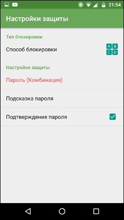 - Для использования текстового пароля для программ (и графического), а не PIN-кода, следует перейти в AppLock в раздел «Настройки», потом в меню «Настройка защиты» выбрать «Способ блокировки», после чего задать необходимый тип пароля. Под пунктом «Комбинация» обозначен произвольный текстовый пароль.