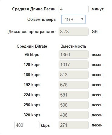 Если слегка повысить точность, то окажется, что ответ во многом зависит от того, как была закодирована песня и, самое главное, в каком формате. Множество специальных программ — музыкальных калькуляторов — вычислят размер получаемого после кодировки файла и количество песен, умещающихся в памяти плеера. Например, для самого популярного mp3 формата On-line калькулятор вычислил такие значения для четырёхминутных композиций: