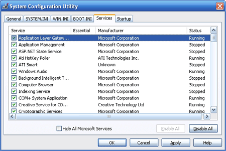 Вкладка «Службы» позволяет включать или отключать любые службы Microsoft Windows или другие программные службы, запущенные на компьютере. Установите флажок «Скрыть все службы Microsoft» в нижней части окна, чтобы видеть только службы, не относящиеся к Windows, такие как службы драйверов и службы программ.Снятие флажка отключает запуск службы.
