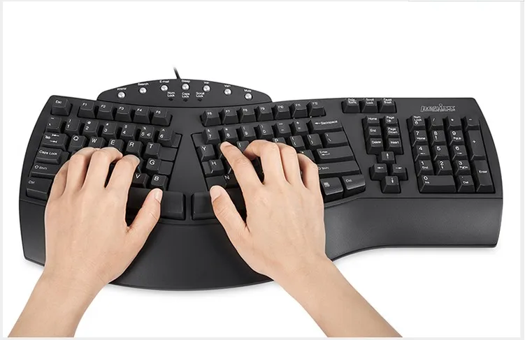 Модель обладает приятными плавными линиями, сама клавиатура как бы встроена в специальную изогнутую «рамку», которая приподнимает корпус над поверхностью стола и образует подставку для кистей. По бокам края рамки выступают и дают возможность положить туда руки и передвигать клавиатуру без риска зацепить клавиши. Такая конструкция придает клавиатуре прочность, а то, что ножки не выдвижные, снижает вероятность поломки.