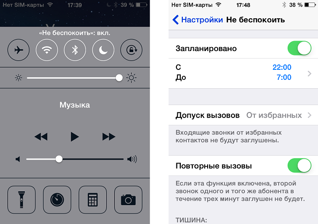- Режим «Не беспокоить». Данная функция позволяет отключать входящие вызовы и уведомления из всех приложений на телефоне, когда экран айфона заблокирован. Если режим «Не беспокоить» активен, то звонящий Вам абонент не услышит звука соединения и вызов с его стороны закончится, а у Вас на айфоне появится уведомление о пропущенном вызове. Отключить функцию «Не беспокоить» можно в настройках телефона, либо в Центре Управления (иконка полумесяца).