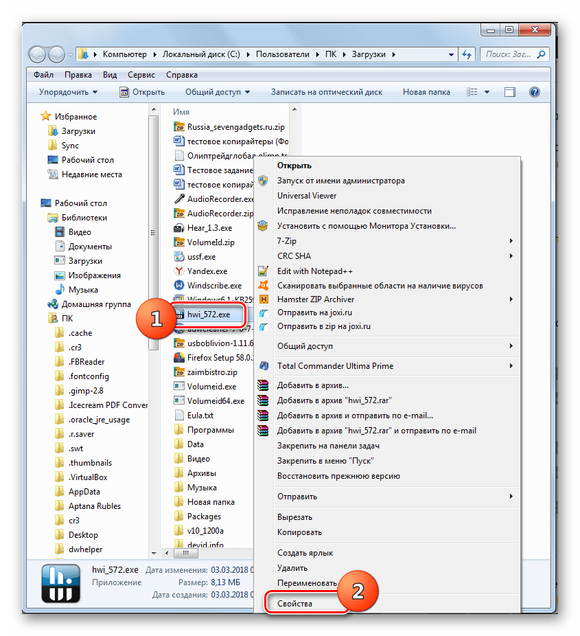 - Щелкайте ПКМ по наименованию программы, которая не открывается. В контекстном списке выбирайте «Свойства».