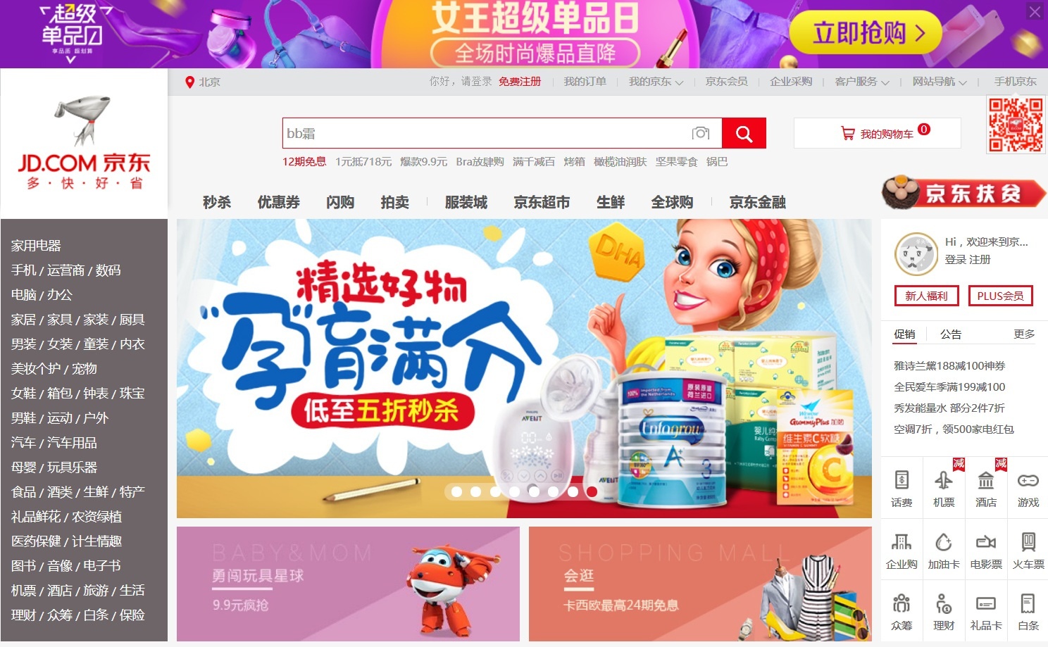 Платформа электронной коммерции JD.com (Источник: JD.com)Jingdong, также известная как JD.com, занимает второе место после Alibaba в гонке электронной коммерции Китая. Как и Tmall, он также продает товары из огромного количества категорий, таких как мода, одежда, электроника, свежие фрукты и лекарства. Поддерживаемый JD Logistics, JD.com может похвастаться собственной сетью доставки, которая охватывает 99% населения Китая, даже клиенты в сельской местности могут наслаждаться быстрой и бесперебойной доставкой.