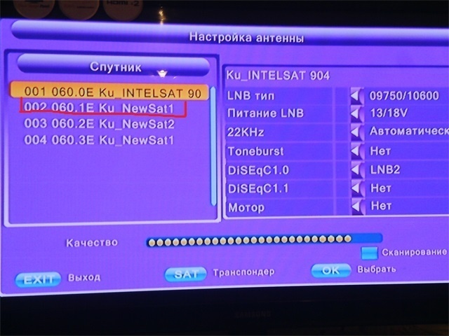 Примечание. Если при настройке шкала силы сигнала заполнена, а шкала качества нет — тарелка попалась не на тот спутник. По той же причине, если обе шкалы заполнены выше 70%, а картинок нет!заезд