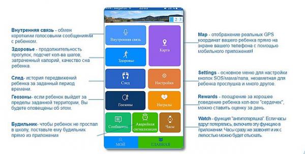 Личный кабинет, персональные данные, смена пароля, список устройств. (в программе можно отслеживать до 6 устройств-часов)