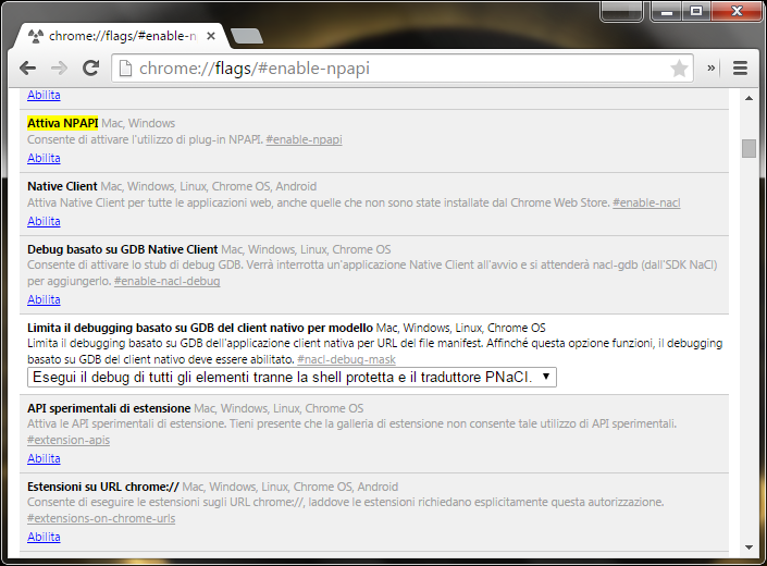 Раньше активация NPAPI в Google Chrome происходила через ссылку: chrome://flags/#enable-npapi. Этот адрес сразу выводил на нужный пункт списка, в котором находятся подключаемые модули.