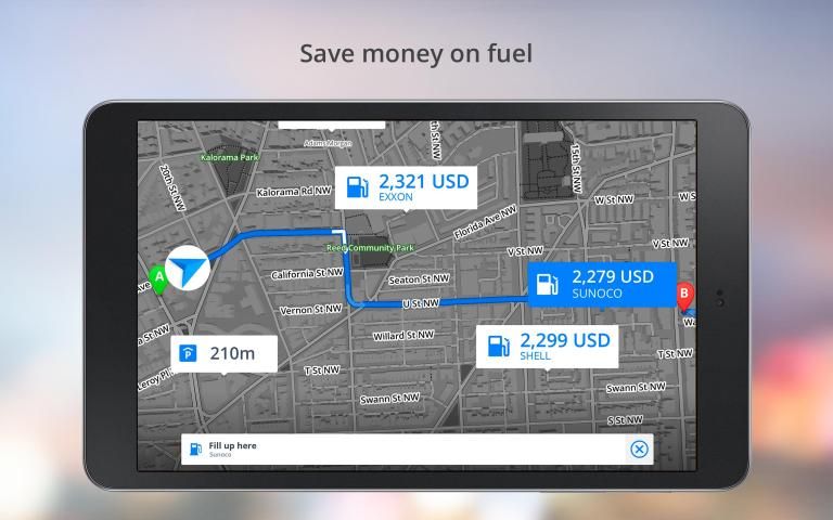 В целом опции GPS-навигатора не сильно отличаются от конкурентов: постройка маршрутов (автомобильных, велосипедных или пешеходных), отображение подобной информации об обстановке на дорогах, предупреждения о камерах, фиксирующих превышение скорости, голосовое управление и уведомления. В наличии также поиск, причем поддерживается интеграция с сервисом Forsquare. Приложение способно работать как в офлайн, так и в онлайн-режиме. Для офлайна часть карт – платные, имейте в виду такой нюанс. К недостаткам можно отнести и нестабильную работу.
