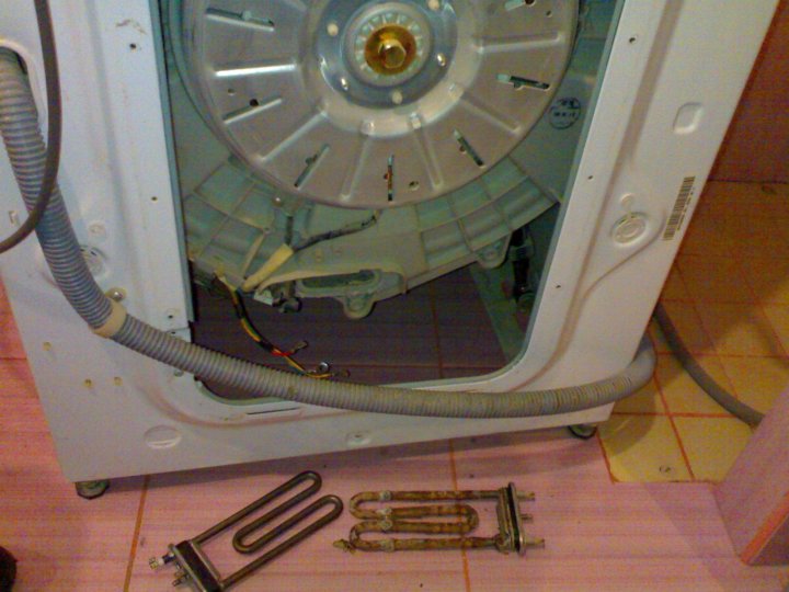- Если выходит из строя нагревательный элемент (ТЭН), это очень опасно. Неисправность этого элемента чревата взрывом, который может заблокировать работу агрегата. Необходимо вытащить его из машины: здесь понадобится замена на новый.