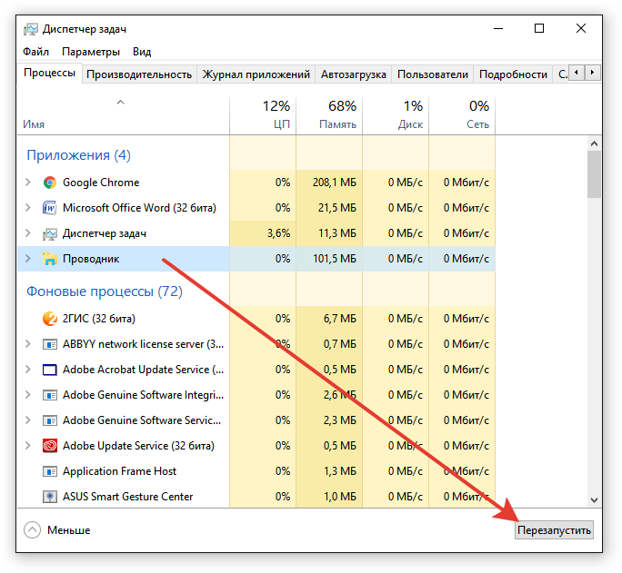 Когда загруженность процессора, ОЗУ и жесткого диска достигает 90-95%, компьютер начинает работать нестабильно и аварийно завершает любой из процессов, который посчитает нужным. Среди них может оказаться и Проводник. Для решения проблемы выполните следующее: