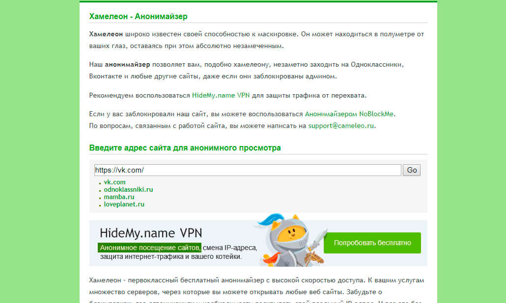 Мета-описание: Хамелеон — бесплатный анонимайзер для Вконтакте и Одноклассников. Теперь вы можете зайти на любой сайт, даже если доступ к нему заблокирован вашим администратором.. Доступ к заблокированным сайтамДоступ к сайтам Хамелеон широко известен своей способностью к маскиро… | ||