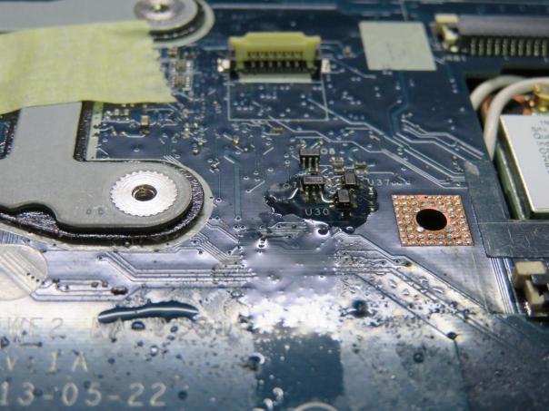 5. Если же когда-то давно Вы залили ноутбук затем включили его и он работает без проблем, однажды он может выключиться и больше никогда не включиться. В таком случае устранение последствий возможно только, заменив материнскую плату. Если жидкость все-таки попала сквозь клавиатуру ноутбука на материнскую плату, это может вызвать множество микрозамыканий внутренних цепей, что неизменно приведет к выходу из строя элементов материнской платы. В таком случае необходимо немедленно отключить питание ноутбука. Включать его после сушки, пытаться почистить или же промыть его категорически запрещено. Даже если микрозамыканий не произошло, протекание тока по проводнику в агрессивной среде жидкости вызовет мгновенную коррозию, что повлечет за собой соответствующие последствия.Залил ноутбук