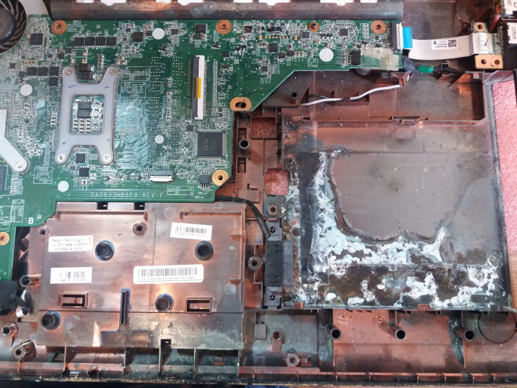 4). Если на ноутбук разлит сок или другая жидкость с агрессивно кислой средой, а также если ноутбук залит агрессивно щелочной жидкостью, например мочой кошки или другого животного, Ваш ноутбук без сложного ремонта на компонентом уровне спасти будет невозможно.