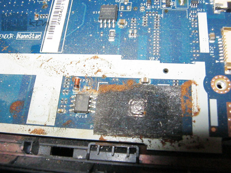Именно поэтому очень важно отдать залитый ноут в сервисный центр как допустимо вероятнее, поскольку с каждым часом коррозия захватывает все большую поверхность матери платы. Чипы на матери плате как губки затягивают под себя влагу, и, если моментально не принять меры, то починка ноута станет невозможным.