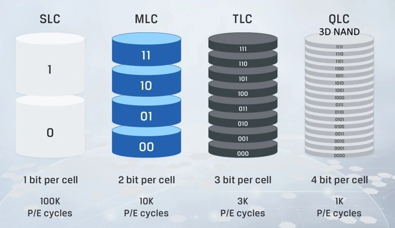 Существует три вида памяти, отличающиеся между собой количеством бит информации в одной ячейке – SLC (1 бит), MLC (2 бита) и TLC (3 бита). Первый тип устарел и сейчас практически не используется, поэтому если увидите его в характеристиках, проходите мимо такого накопителя.