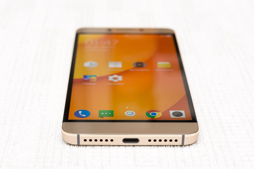 На задней грани расположилась основная камера с LED вспышкой, зеркальная площадка под сканер отпечатков пальцев и логотип Le. Сверху находится ИК-порт для управления техникой в доме, а снизу микрофон с динамиком и двухсторонний USB Type-C порт для зарядки и подключения наушников. На левой грани есть выдвижной SIM-трей на две Nano-SIM карты, а на правой — клавиша блокировки и сдвоенная клавиша регулировки громкости. Примечательно, что привычного нам 3.5 мм аудио выхода у смартфона нет, такова новая политика у LeEco.