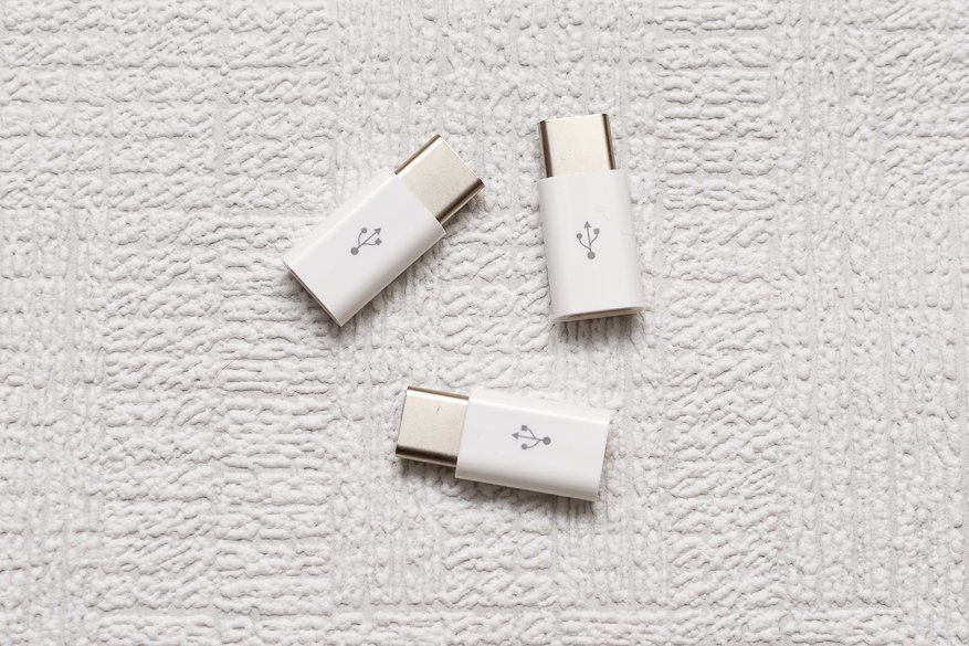 Комплектный кабель USB A <> USB Type-C имеет длину около 1 метра, толстый и визуально качественный. Если у вас дома завалялось много хороших кабелей micro-USB, то не лишним будет докупить себе несколько переходников micro-USB > USB Type-C. Можно купить пачку переходников низкого качества за 1$, а можно качественные по 1-3$ за штуку. Вот, например, 3 штуки за 1$ (никогда такие не покупайте, они плохого качества):