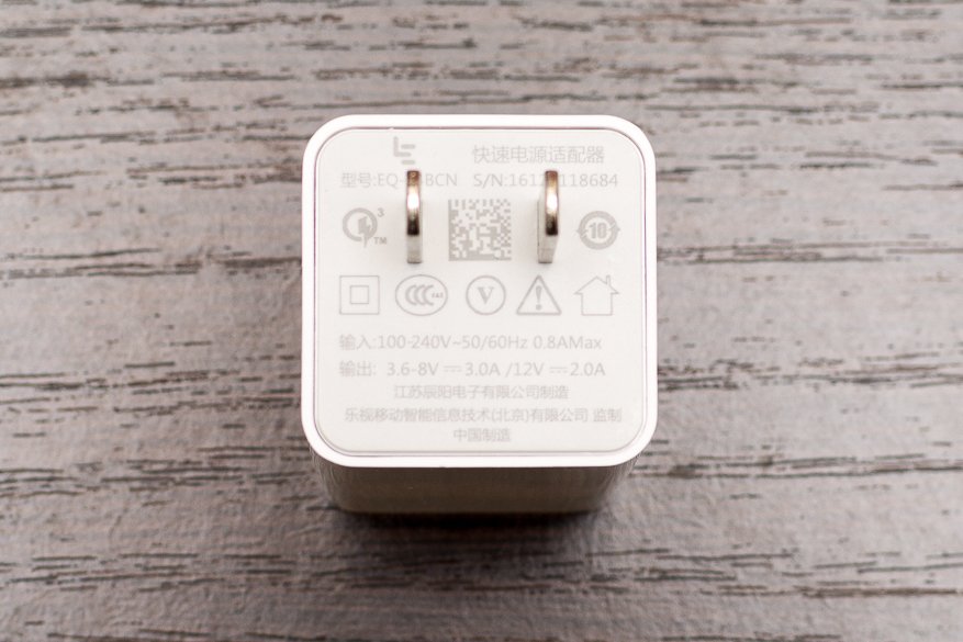 Комплектный блок питания, «зарядное устройство» для простоты, достаточно крупный и тяжёлый. Поддерживается технология Qualcomm Quick Charge 3.0. Максимальная мощность большая — 24 Вт. Чаще всего, ЗУ с поддержкой QC 3.0 имеют мощность 18 Вт — 9 В / 2 А и 12 В / 1,5 А. Я сначала не совсем понял, зачем этому смартфону такое мощное ЗУ, но всё встало на свои места, когда я тестировал зарядку смартфону, о чём будет написано в соответствующем разделе.