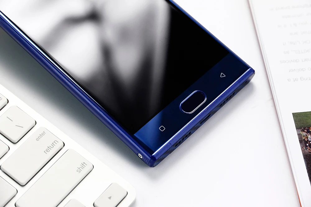 В верхней части передней панели телефона OUKITEL расположена фронтальная двойная камера, разговорный динамик, а левее — светодиодная вспышка. В нижней части, под экраном, находится механическая кнопка Home, в которую встроен сканер отпечатков пальцев, и сенсорные кнопки — назад и приложения.