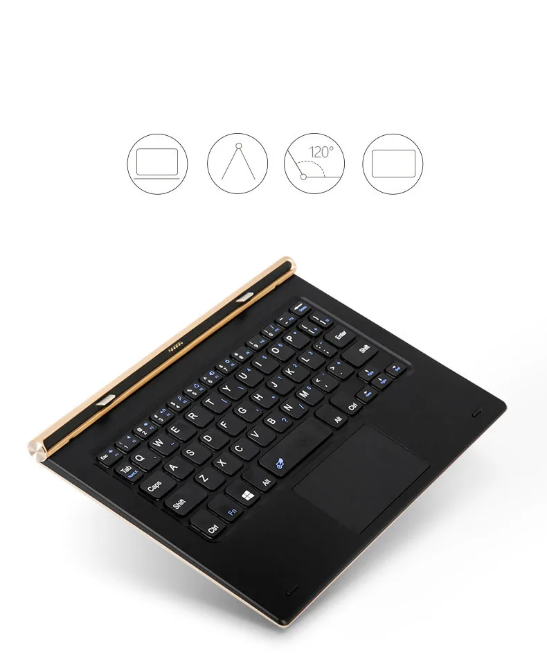Клавиатура поставляется с удобными клавишами, довольно разумным трекпадом, но он кажется довольно тесным и иногда не очень точным. Аксессуар весит 600 грамм и имеет толщину 8 мм. Он также окрашен в золотой цвет и имеет цилиндр в области шарнира, что напоминает мне устройство Lenovo Yoga. Его резиновые ножки помогают ему лучше сидеть на скользкой поверхности.