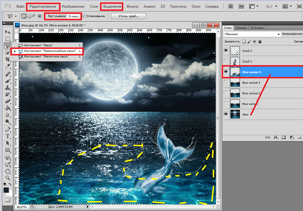 - Пользоваться стандартными для Photoshop комбинациями клавиш для снятия выделения, выделения нескольких объектов, отмены действий и другими.