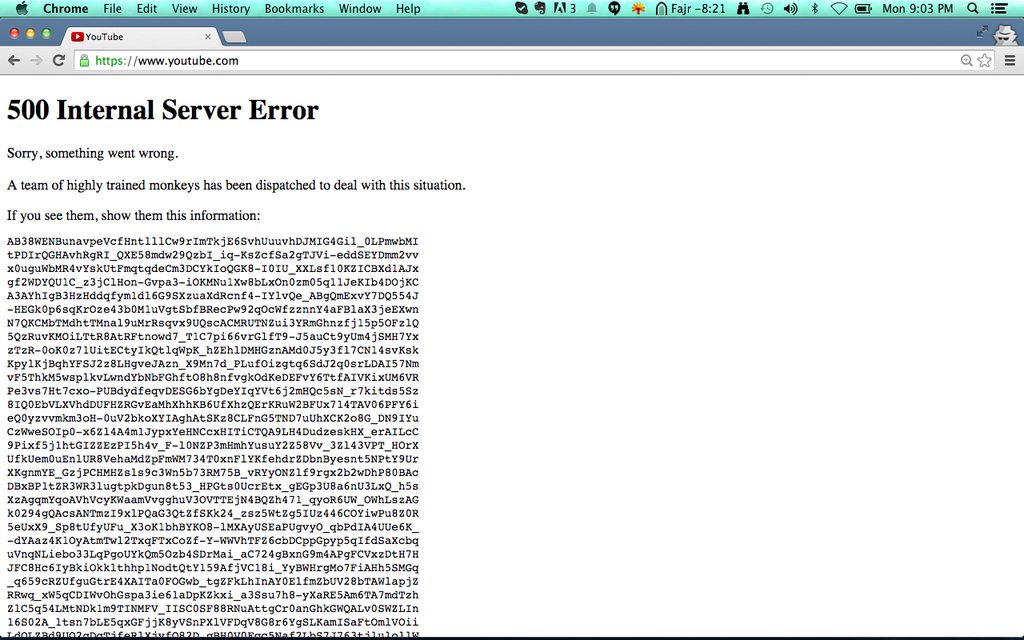В большинстве случаев ошибка возникает в окне интернет-браузера.В результате вы можете увидеть эту ошибку каждый раз, когда пытаетесь открыть страницу YouTube. Технически сервер YouTube не работает, и, следовательно, вы не сможете смотреть свои видео так, как вам нравится. Однако необходимо отметить, что YouTube не всегда может обрабатывать запросы из-за этой ошибки. Это потому, что ошибки или другие основные проблемы в основном вызывают эту ошибку.