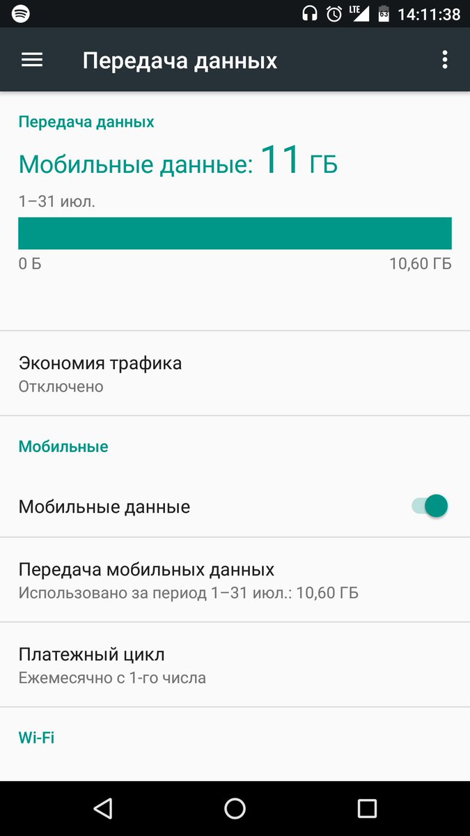 Здесь можно увидеть сколько трафика было использовано за последний месяц и воспользоваться функциями, которые позволяет управлять расходами на мобильный Интернет. Также здесь есть информация об объеме информации, которая была передана через Wi-Fi.