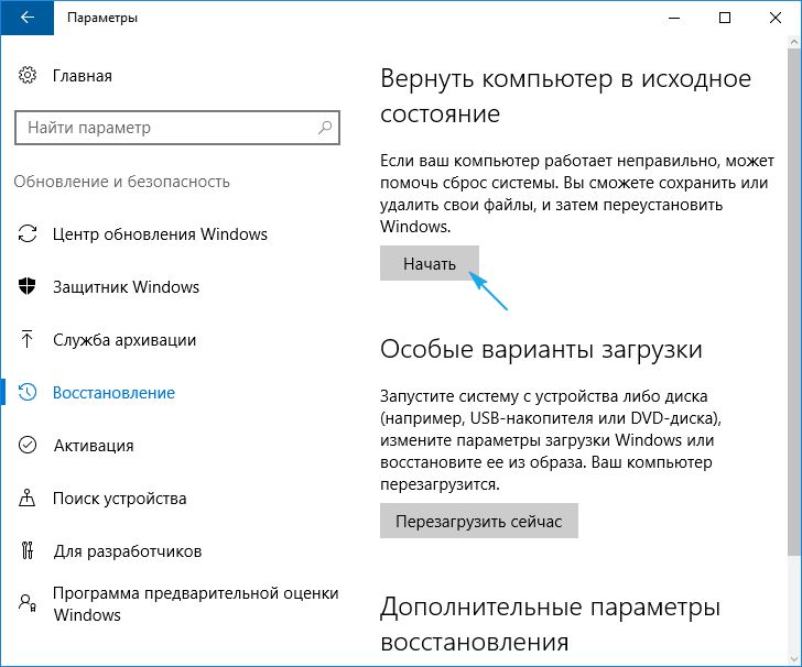 - Открыв программу «Параметры», зайдите во вкладку «Обновление и безопасность». В подпункте «Восстановление» есть блок о возврате компьютера в первоначальное состояние. В нём нужно кликнуть по кнопке «Начать», чтобы запустить процедуру отката.