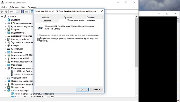 - Перейдите во вкладку Управление электропитанием и снимите галочку Разрешить этому устройству выводить компьютер из ждущего режима. Нажмите ОК