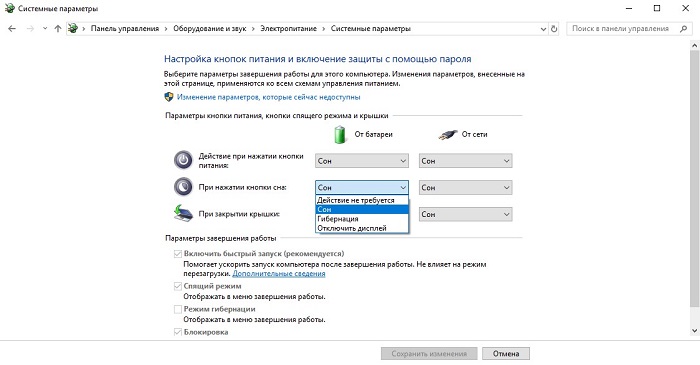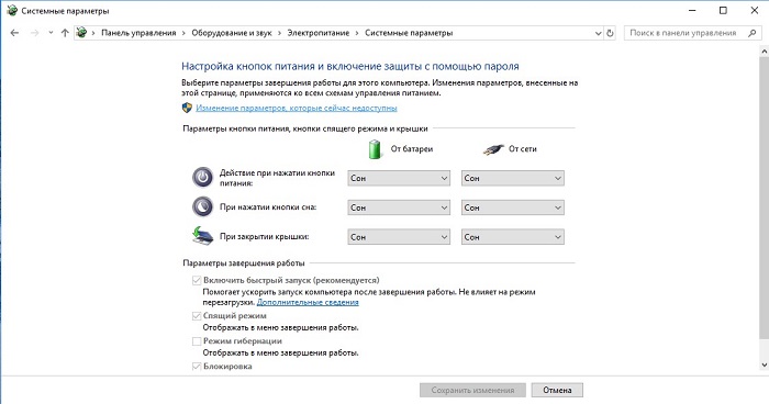 - В окне настройки системных параметров кнопки питания выберите настройку «Изменение параметров, которые сейчас недоступны».