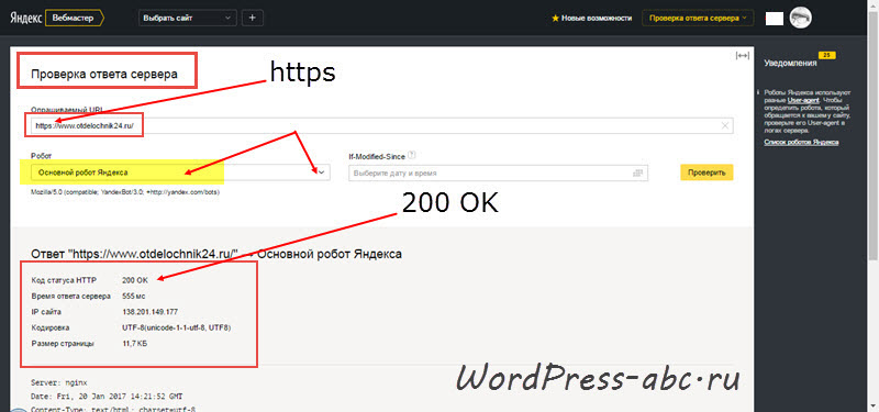 Инструмент в Яндекс.Вебмастере покажет код статуса HTTP.