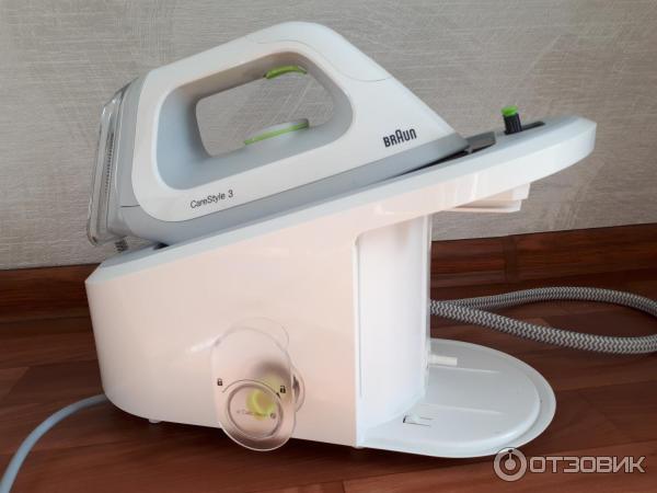 Устройство защелкивается на базе, для удобства переноски. Часто на парогенераторы бывают жалобы, что они довольно шумные. У этого же уровень шума минимален. Сам утюг очень легкий. Даже на фотографии видно, что он выглядит компактно относительно иных моделей.