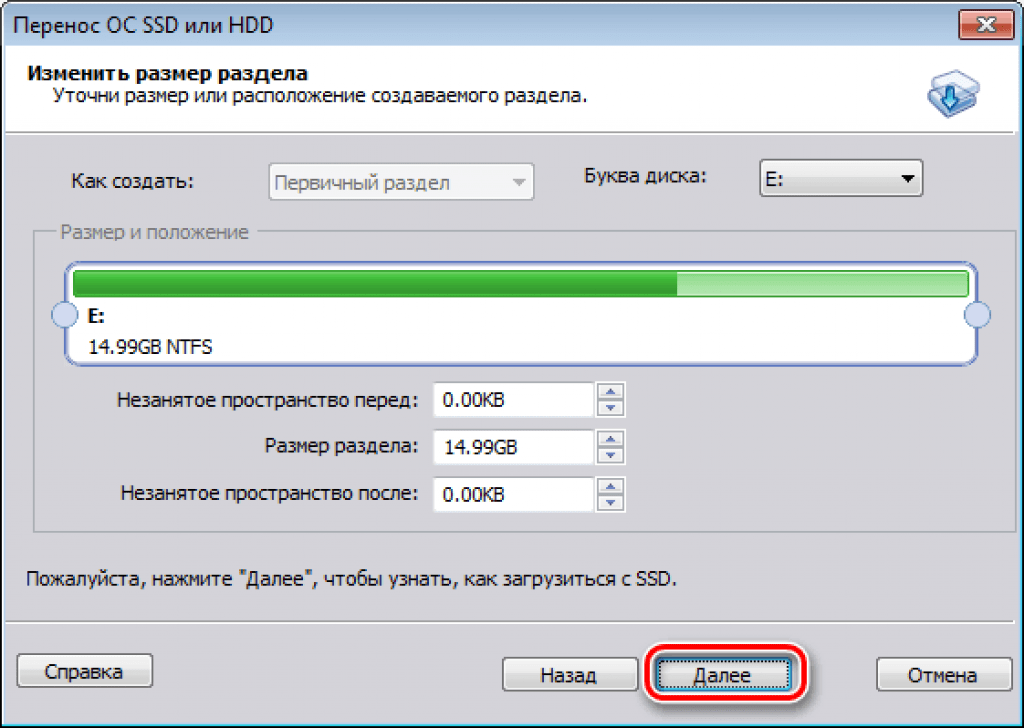 Вы можете установить размер раздела на целевом диске, перетаскивая стрелки между краями раздела, как показано ниже: