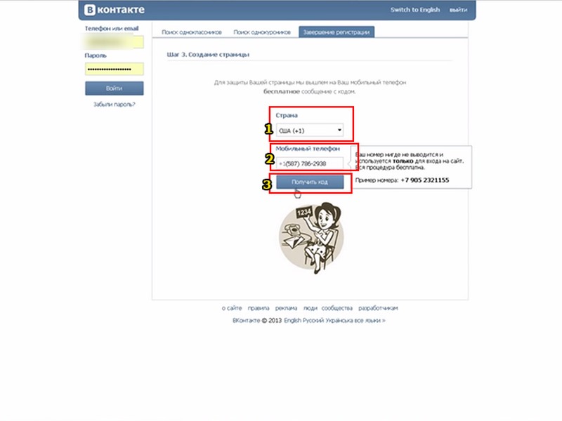 Когда вам предложат указать мобильник – введите выбранный номер. Правильно укажите страну по начальным цифрам, если это «+1», выставляйте США. Кликните на «Получить код». Вам остается перейти на сайт онлайн-сервиса, прочесть смс и вписать код из нее в ВК.