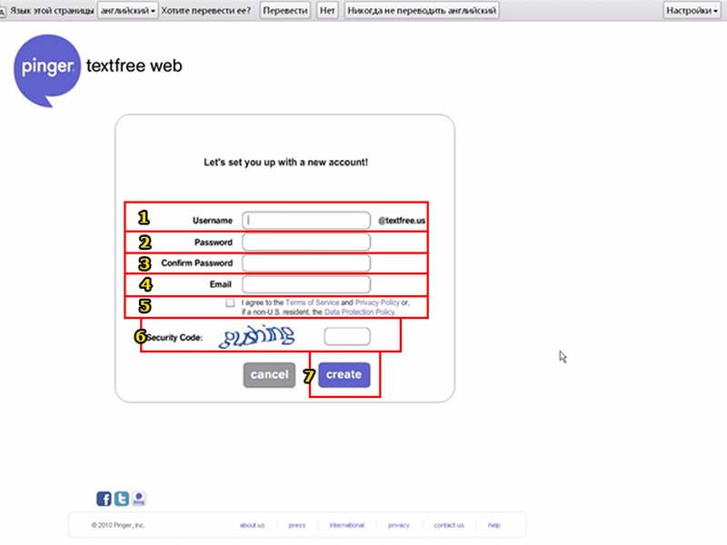 Под формой регистрации появится строчка, куда затем пользователь должен будет ввести код. Смотреть код нужно на странице виртуального телефона в Pinger – этот номер был создан в разделе данной инструкции про этот сервис.