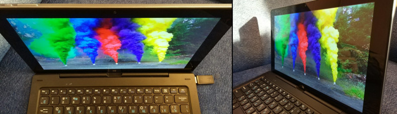 Дисплей изготовлен по технологии IPS, поэтому под углами изображение не инвертируется и не засвечивается. Цветовых искажений также нет. Под экстремальными углами немного падает общая яркость. В сравнении с недорогими ноутбуками — небо и земля. Экран в разы лучше убогих TN матриц с разрешением 1366×768. После Cube включать свой более мощный, но с унылым экраном ноутбук — совсем уже не хочется.