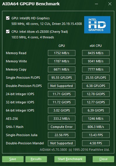 В 11 версии как раз есть сравнение с Z8300, который набирает в тесте процессора 1.08 pts, а наш Z8350 — 1.25 pts. Получается прирост производительности по процессору составляет около 16%. В графике результат такой же, как и у предшественника — 7,23 fps. Графическое ядро — то же: Intel HD Graphics Gen8 (частота до 500 mHz). В 15 версии процессор набрал 100 cb.
