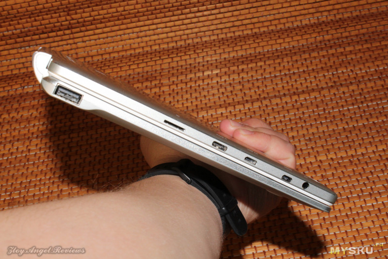 Устройство не может похвастать большим количеством полноразмерных USB разъемов, но в режиме планшета их много и не нужно. А вот при подключении клавиатуры, для использования в режиме ноутбука — добавляется еще 2 полноценных USB разъема и теперь их общее количество становится равно 3. На клавиатуре USB симметрично размещены на противоположных гранях.