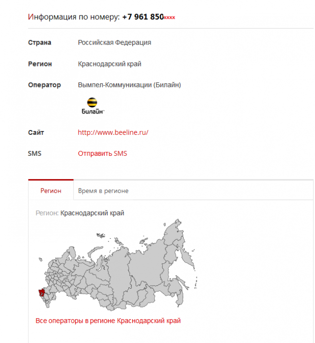 К сожалению, сегодня по всем цифрам номера телефона поиск не работает, и при вводе последней цифры выходит ошибка. Тем не менее, результат можно получить по всем цифрам, кроме последней, оператор назван, регион определен, информация о номере нам доступна.