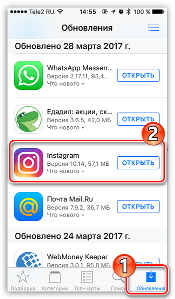- Теперь найдите Instagram в списке. Если он присутствует, будет доступно обновление. Нажмите на Обновить.