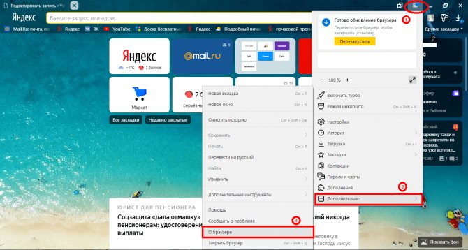 - Дальше в выпадающем меню выбираем «Дополнительно» и «О браузере» или переходим по ссылке browser://help.