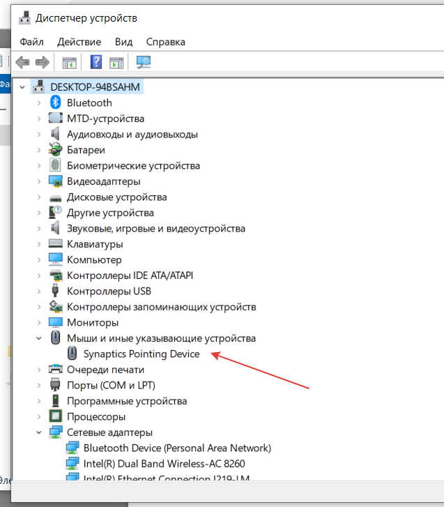 Если тачпад точно включён, но по‑прежнему не работает, возможно, причина в драйвере, который повреждён или не установлен. В Windows откройте через поиск «Диспетчер устройств», найти в списке раздел «Мыши и иные указывающие устройства» и выберите его. Здесь должен отображаться тачпад, обычно под именем Synaptics TouchPad или TouchPad, и название производителя. Иногда вместо этого показывается просто «HID‑совместимая мышь».