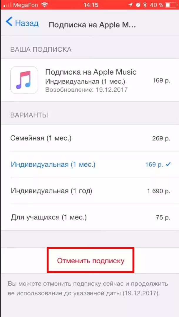 Когда вы отменяете подписку на Приложение, большинство Сервисов позволяют вам продолжать пользоваться им до истечения срока действия подписки. Это не относится к некоторым бесплатным версиям. Например, если вы отмените подписку на Apple Music, вы сразу потеряете доступ к премиум-сервису.