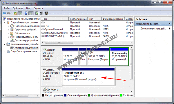 Система управления дисками позволяет манипулировать любыми запоминающими устройствами: скрывать, разделять, объединять и т.д. Поскольку утилита работает со всеми носителями, она может помочь, когда Виндовс 10 не видит ЮСБ.