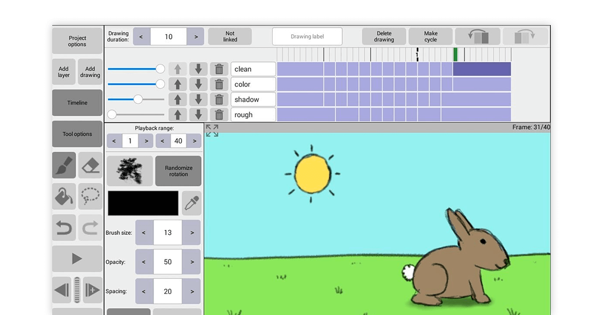 Еще одно анимационное приложение, Rough Animator, работает аналогично Animatic, что позволяет создавать покадровые анимации. Среди функций, он имеет инструменты для управления частотой кадров и разрешением и может быть экспортирован в формате GIF или видео. Нажмите на ссылку, чтобы загрузить Rough Animator.